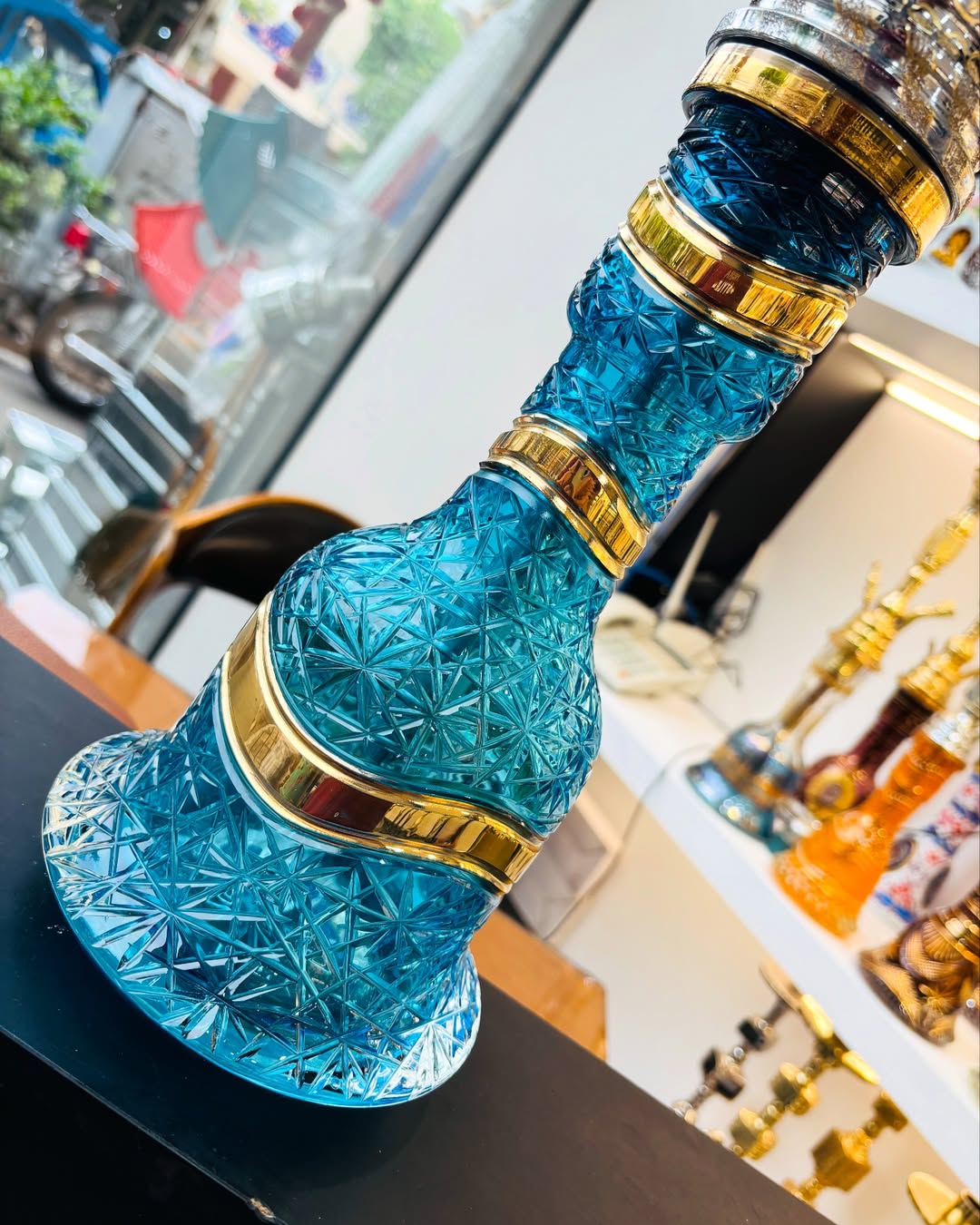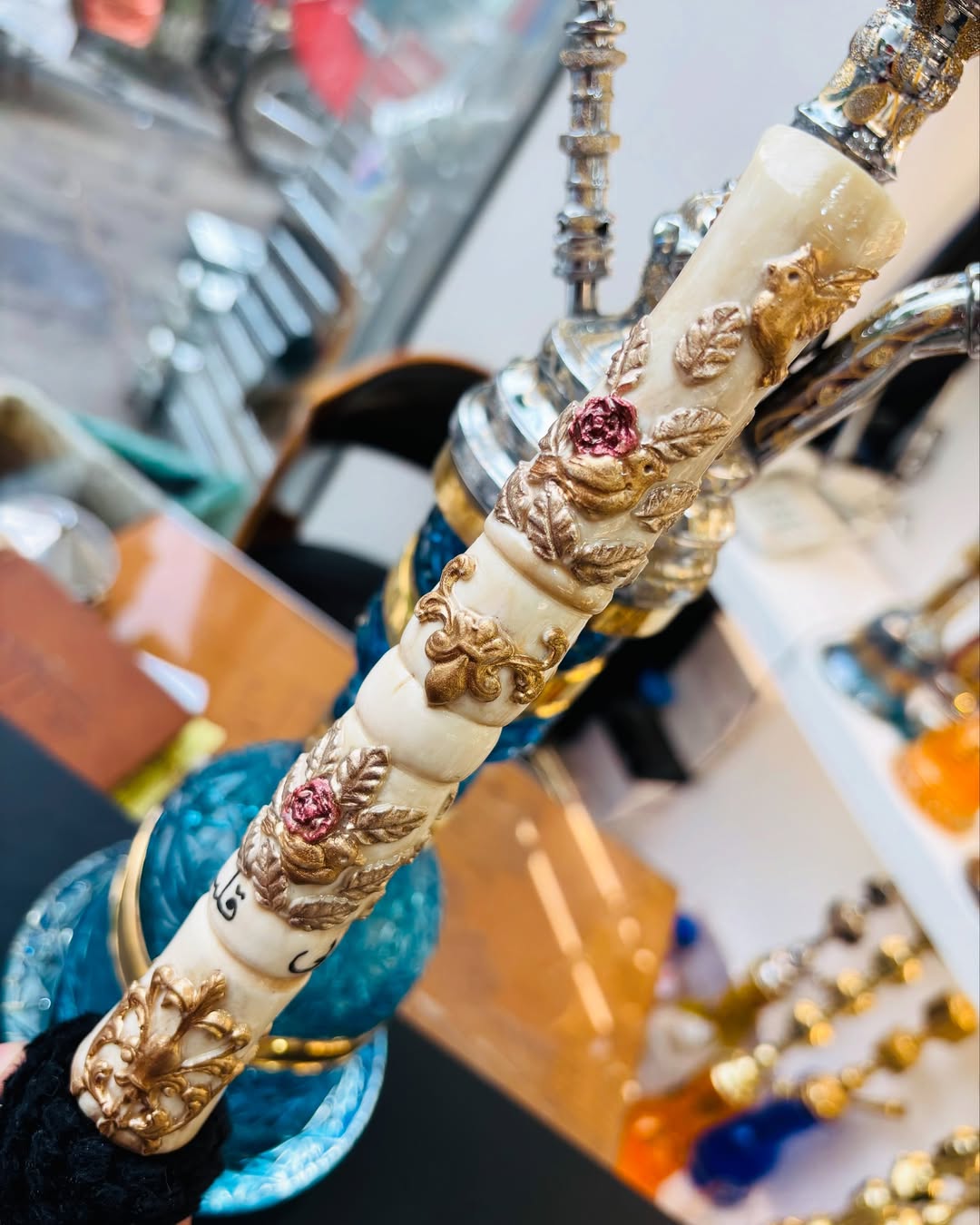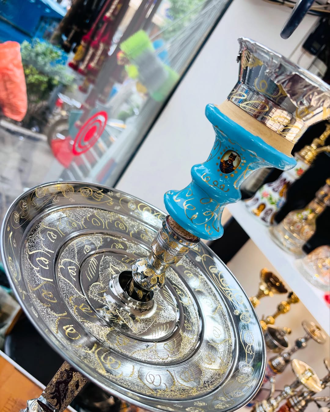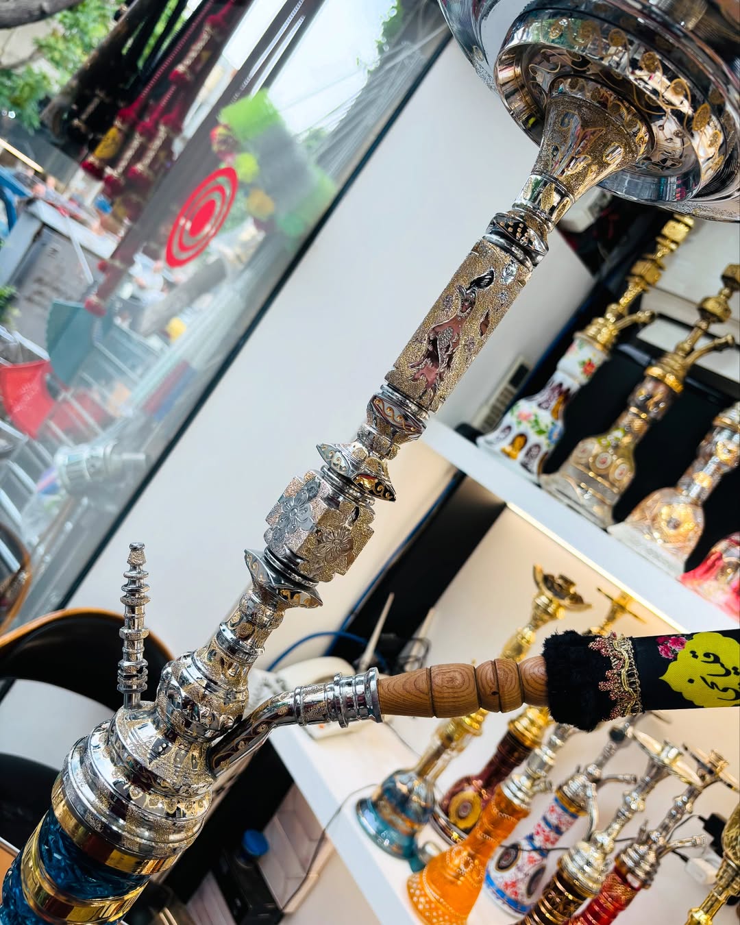 شمش دو مرتبه تنه شمش برنج آبکاری کروم رنگ ثابت قلمکاری شده لوله مس شلنگ چرم قلیانچی لبی شلنگ کامل استخوان برجسته سینی برنی قلمکاری سری شاهی بهمراه بادگیر برنجی شیشه طلاکوب نقاشی رنگ ثابت