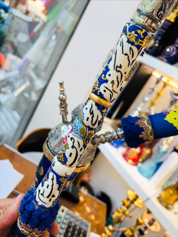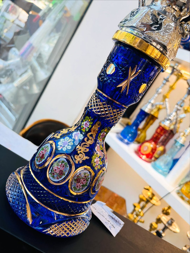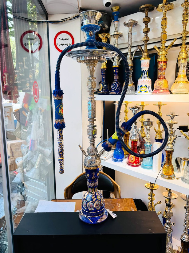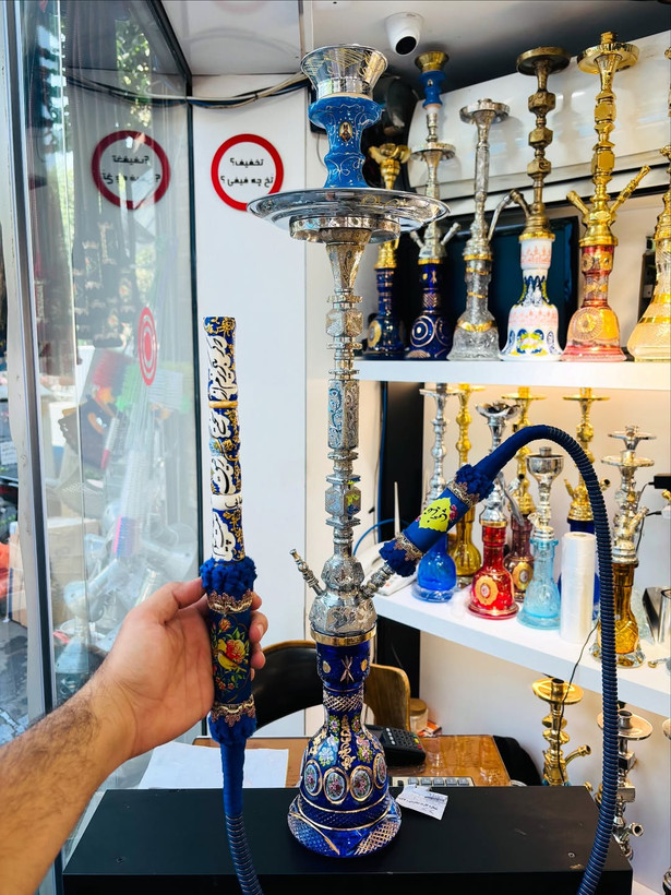 شمش سه مرتبه تنه شمش برنج آبکاری کروم رنگ ثابت قلمکاری شده لوله مس سوپاپ دار شلنگ چرم قلیانچی لبی شلنگ کامل استخوان برجسته سینی برنی قلمکاری سری شاهی بهمراه بادگیر برنجی شیشه طلاکوب نقاشی رنگ ثابت