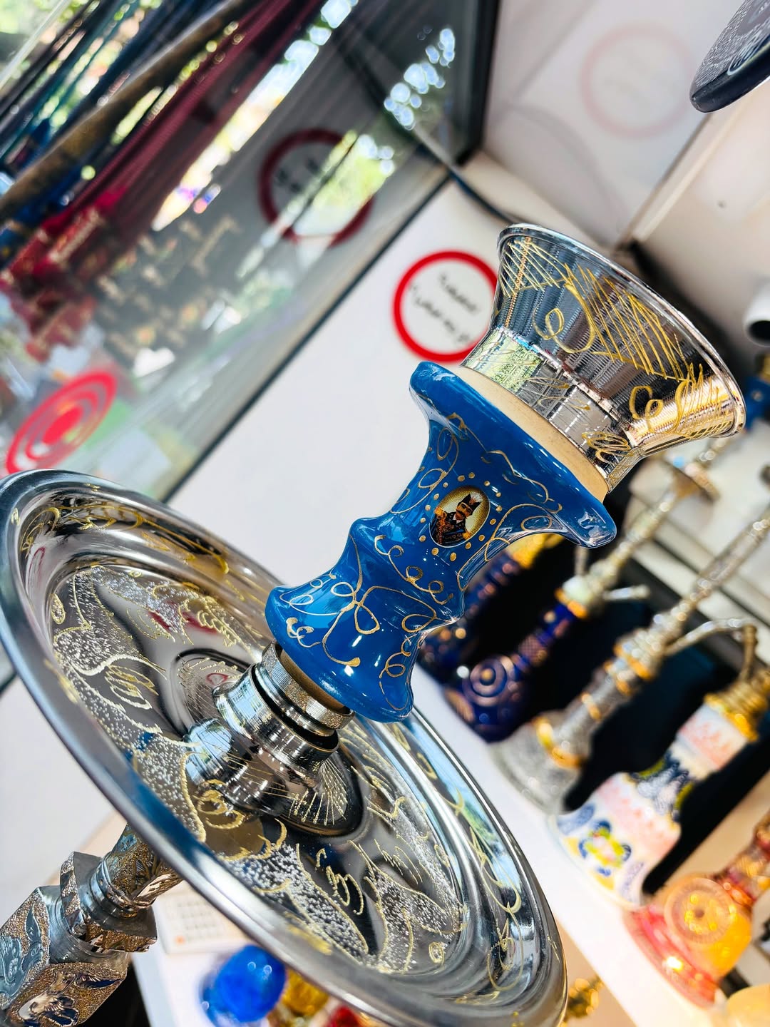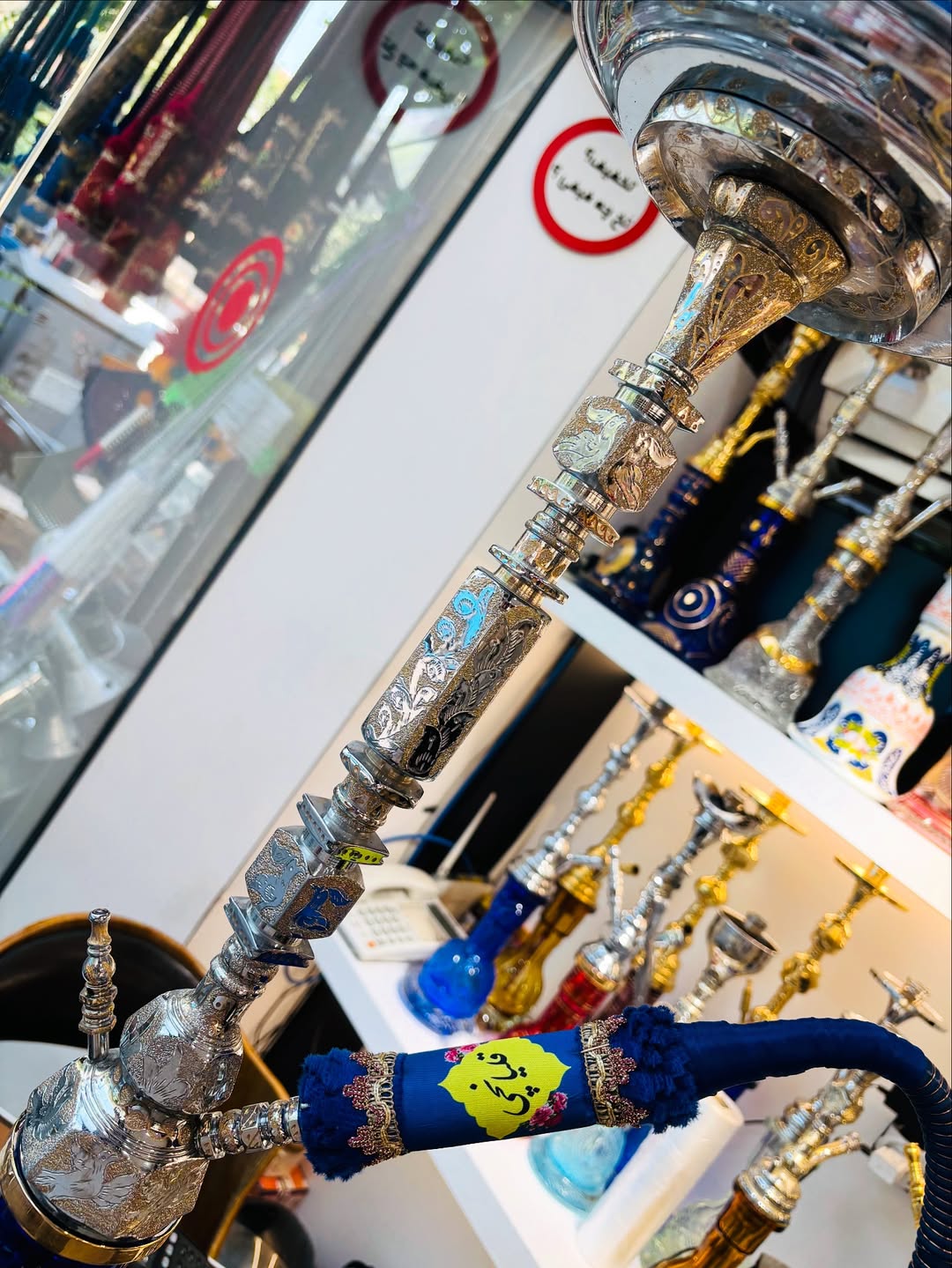 شمش سه مرتبه تنه شمش برنج آبکاری کروم رنگ ثابت قلمکاری شده لوله مس سوپاپ دار شلنگ چرم قلیانچی لبی شلنگ کامل استخوان برجسته سینی برنی قلمکاری سری شاهی بهمراه بادگیر برنجی شیشه طلاکوب نقاشی رنگ ثابت